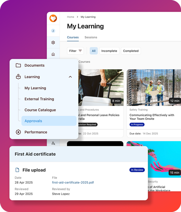 Centralise your learning assets. Store and track all learning, certificates, file uploads and external training in one secure, central hub, with instant access and full visibility.