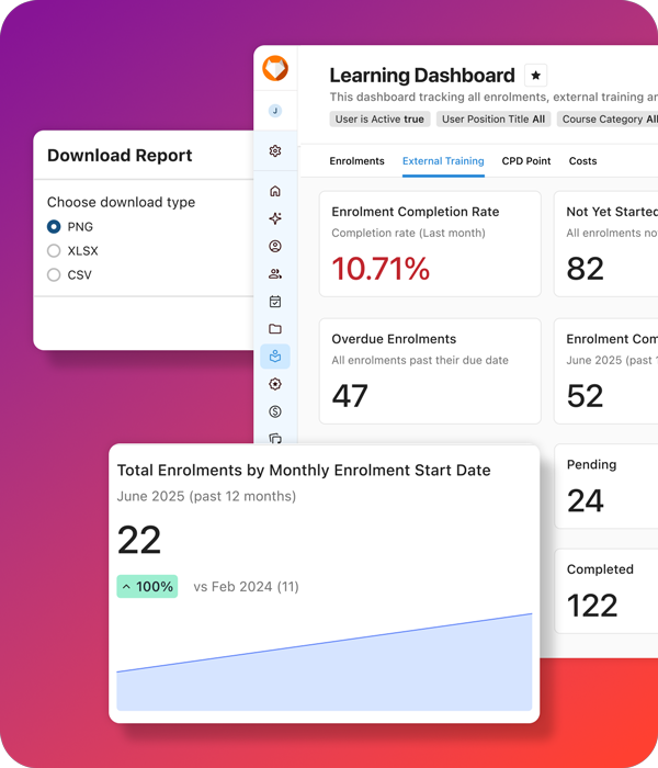 Make data your edge. Visualise learning progress with real-time dashboards, spot compliance risks early and easily export insights for C-suite, boards or managers.